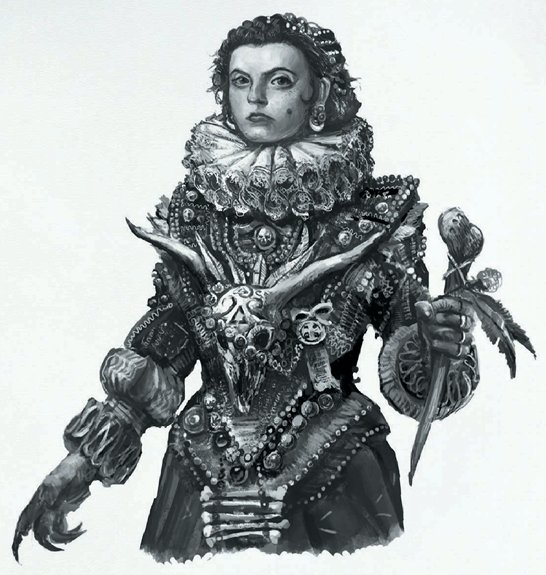 Łącząca w sobie grację estalijskiej arystokracji, majestat imperialnej szlachty i pierwotne energie wiatru Ghur, szanowana członkini reiklandzkiej śmietanki towarzyskiej i jednocześnie Mistrzyni Szamanek, Magistra Kolegium Bursztynu.